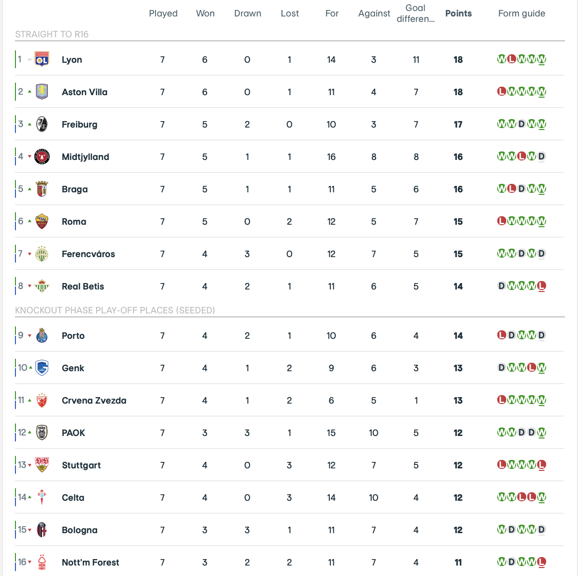 Her vil førnævnte Braga, Roma, Ferencvaros, Real Betis og FC Porto kunne overhale via en sejr, mens også Røde Stjerne og Genk potentielt kan blande sig – for de to sidstnævnte kræver det dog mere end blot tre point, men også en markant forbedret målscore.